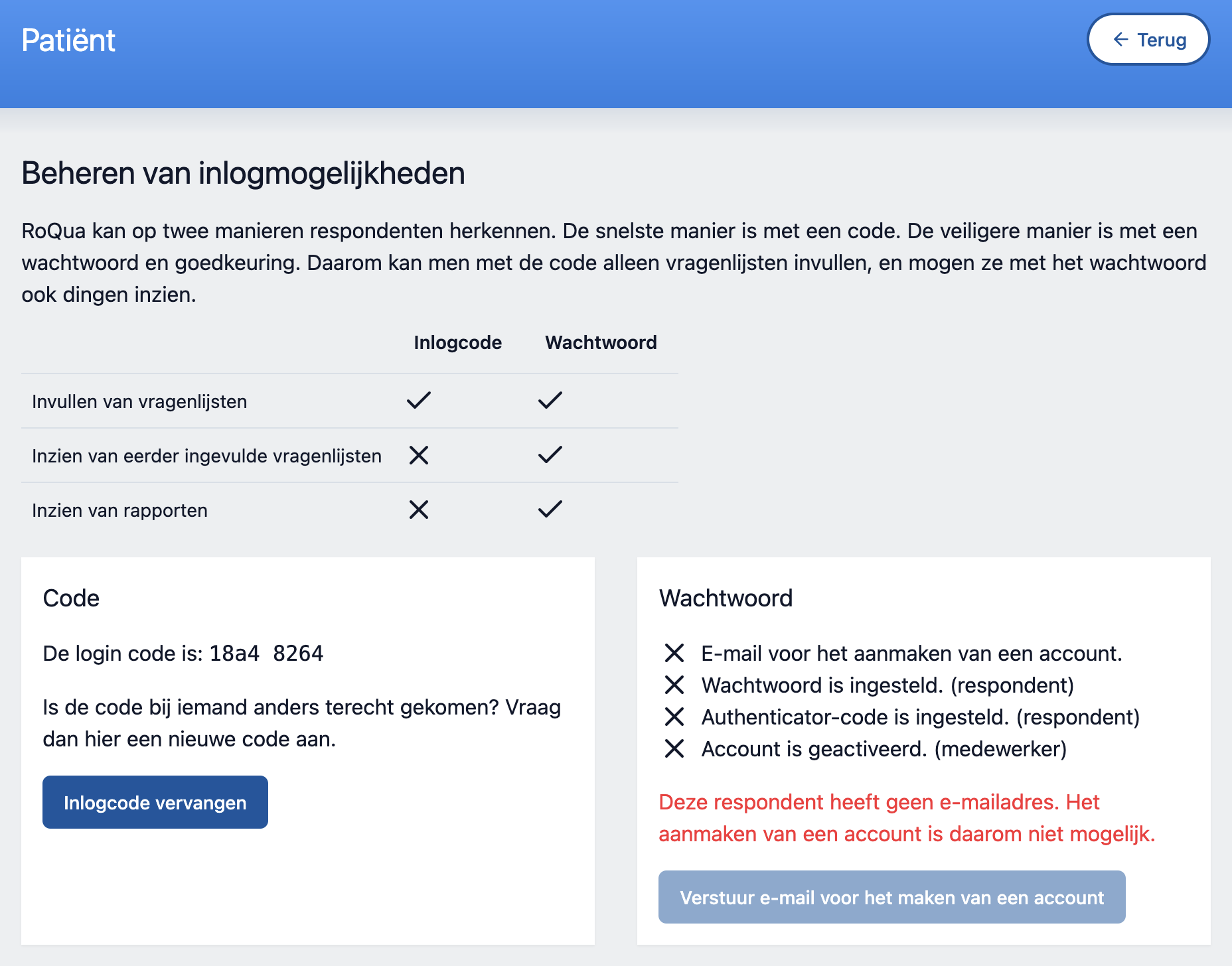 Na het instellen van een 2-factor authenticatie, wordt de gebruiker naar het portaal doorgestuurd, maar heeft de respondent nog geen toegang. De respondent moet namelijk (als extra verificatie) nog een goedkeuring krijgen van de behandelaar. Dit gebeurt weer op dezelfde 'beheer login' pagina op het EPD. Klik hier op 'Respondent login activeren'.