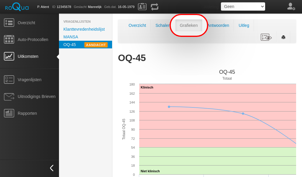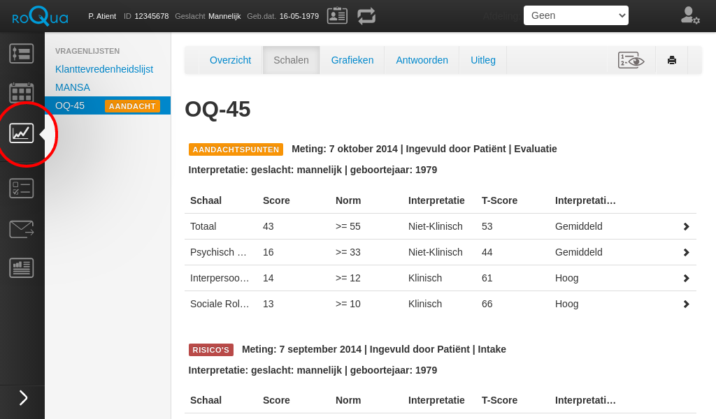 Klik op het tabje "Grafieken" voor een grafische weergave van de berekende schaalscores over de tijd.