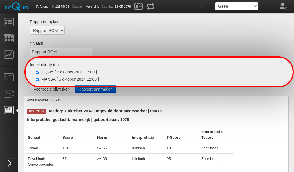 De knop "Rapporten" bovenaan de timeline geeft toegang tot de rapportage functionaliteit van RoQua. Hiermee is het mogelijk om de gegeven antwoorden of een tabel of grafiek van de berekende schaalscores voor verschillende vragenlijsten in één document te combineren. Dit document kan vervolgens afgedrukt of gedownload worden voor communicatie met collega's en patiënten of voor het bespreken van patiënten in teamverband. De Phamous brief aan de huisarts is een voorbeeld van een dergelijk document.