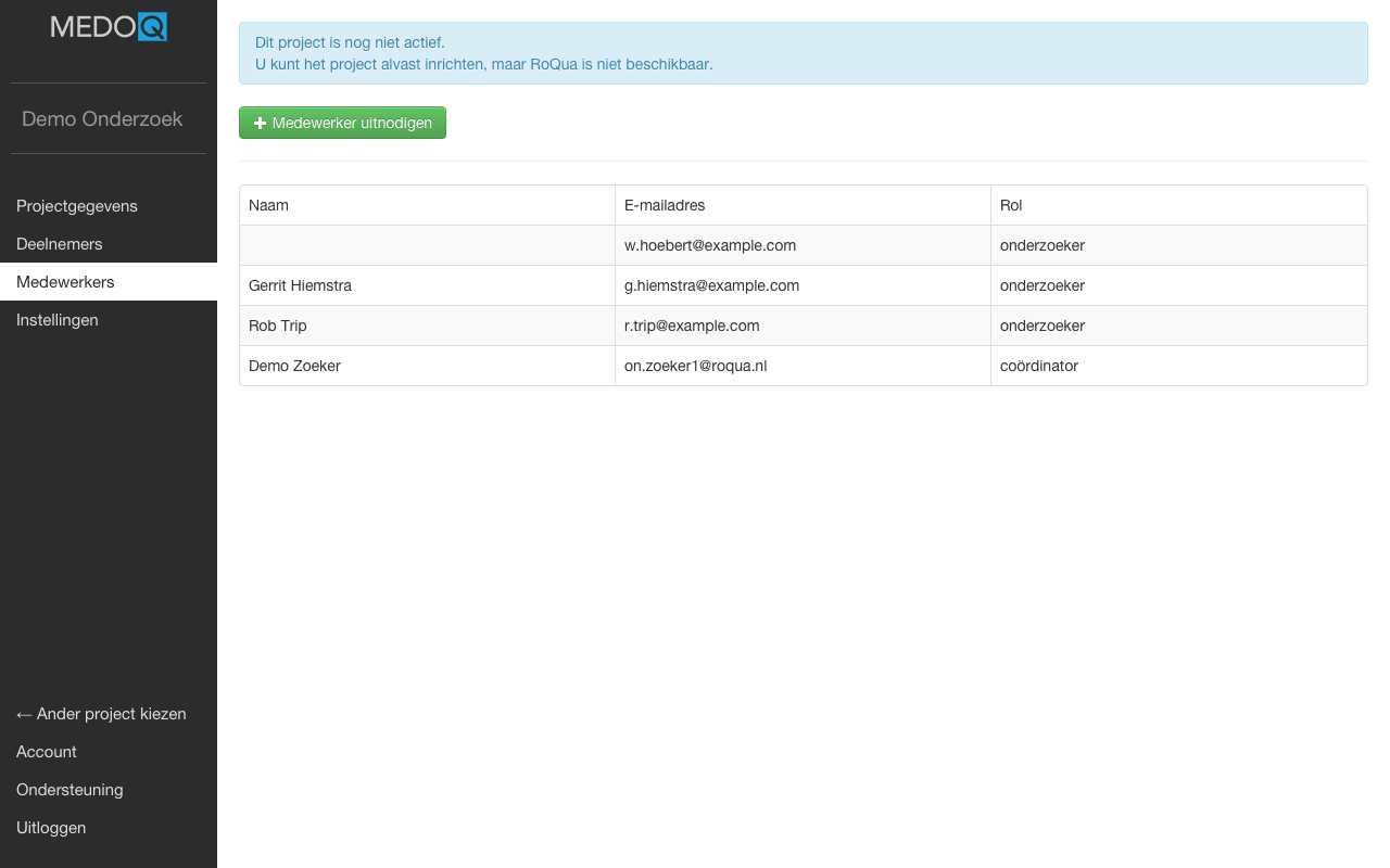 Een medewerker moet één van drie rollen toegewezen krijgen. Verzamelaars kunnen proefpersonen beheren en bij RoQua inloggen om de voortgang van een proefpersoon te controleren. Onderzoekers kunnen anonieme gegevens van een proefpersoon en de projectspecifieke gegevens bekijken. Ook kunnen ze bij RoQua inloggen om de resultaten van een onderzoek op te halen. Coördinatoren kunnen alles wat verzamelaars kunnen. Daarnaast zijn ze bevoegd om een project te beheren.