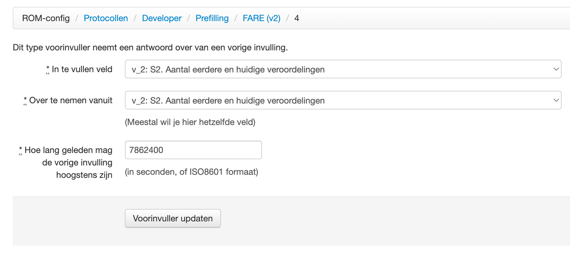 • "Maximum age": To prevent copying over data from an old and finished treatment, you need to specify the maximum age of the previous completion for it to be viable for prefilling. We apologise for the inconvenience, but for technical reasons this value is given in seconds, although you can also enter it in ISO8601 format.
