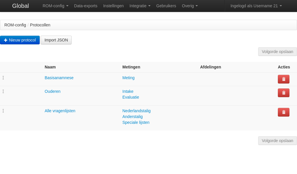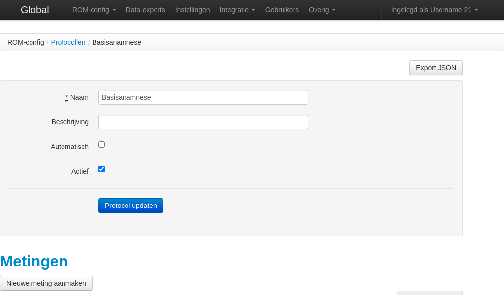 The overview of protocols shows which protocols there are, and which measurements that protocol has. It is also possible to make a new protocol here. Clicking on the name of the protocol provides access to managing measurements from that protocol, while clicking on the name of a measurement goes directly to managing that measurement, where questionnaires can be assigned to that measurement.