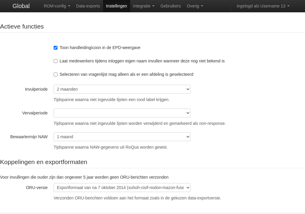Here you can make some settings for the RoQua application such as the display of a link to the manual in the RoQua interface and whether practitioners will be asked for their personal information when they first use RoQua. You can also specify after which period prepared questionnaires receive a red label and which export format is used for sending ORU messages.