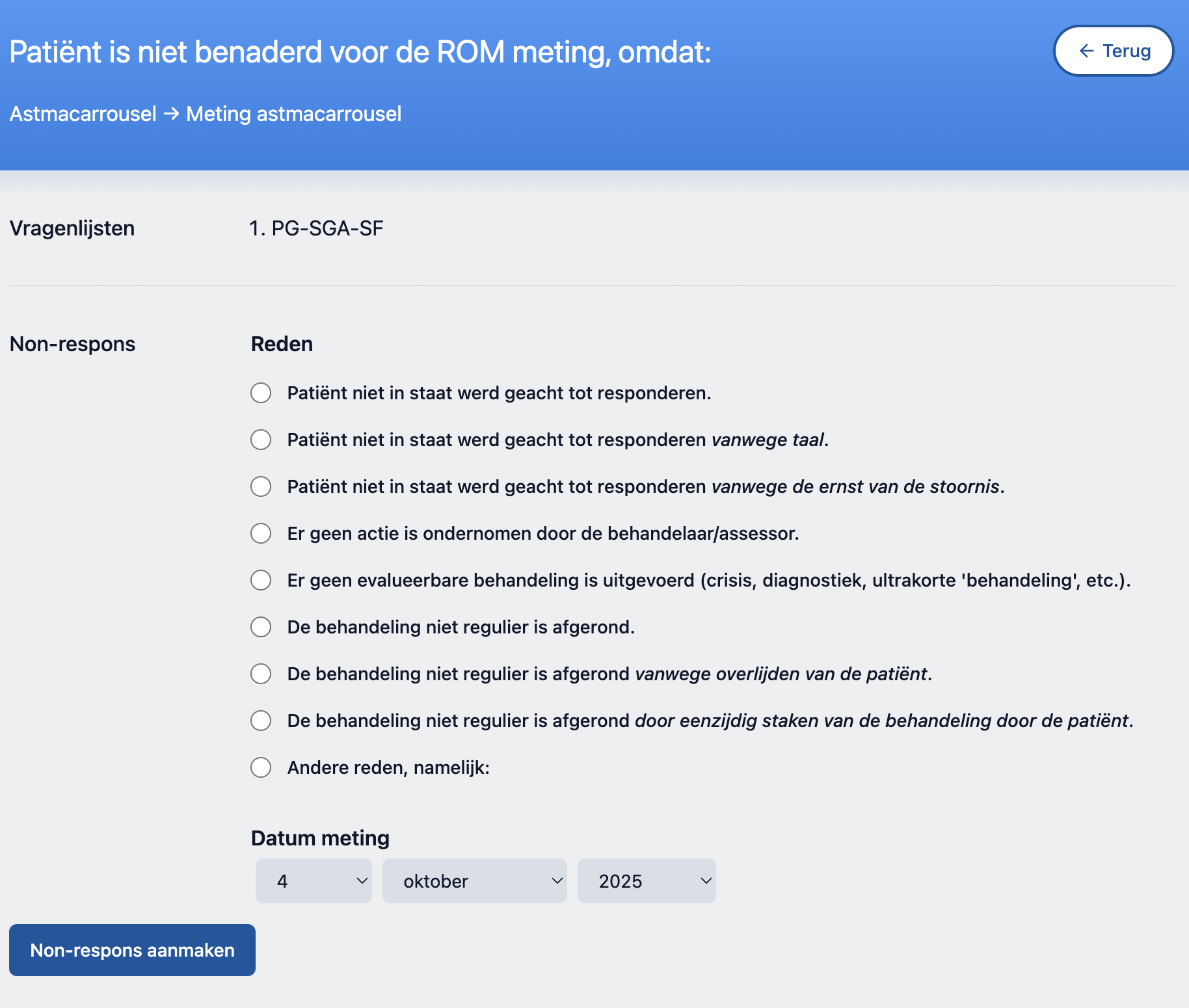 Select the reason for non-response and click "Create non-response". When the non-response concerns a measurement from the past, the date of non-response can be specified under the heading "Measurement Date".
