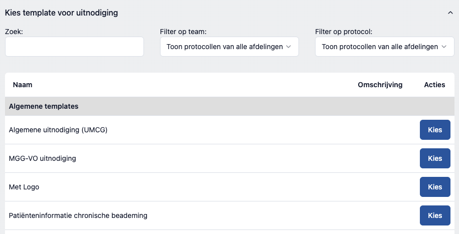 The next step is to choose the right template for the invitation. The list of templates is grouped by protocol. Some templates are marked as "general", and these are in the very first group. A template can be linked to multiple protocols at the same time, and then you will see it in multiple groups.